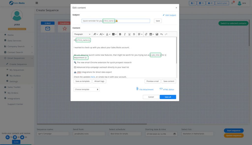 Customize and personalize your emails with custom fields that will make your emails appear hyper-personalized despite being automated. Personalizing the email copy based on a person’s name, job title and company they work is a nice option to have. But with our custom tags, you can tailor your emails based on every data point we have on a prospect.