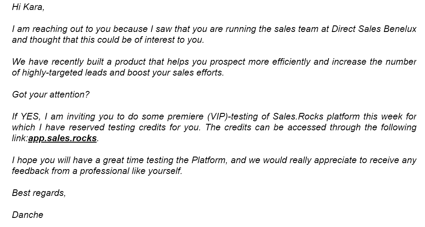 For example, in our emails, we open with this (assuming that the recipient’s name is Kara and she is the head of sales at Direct Sales Benelux):