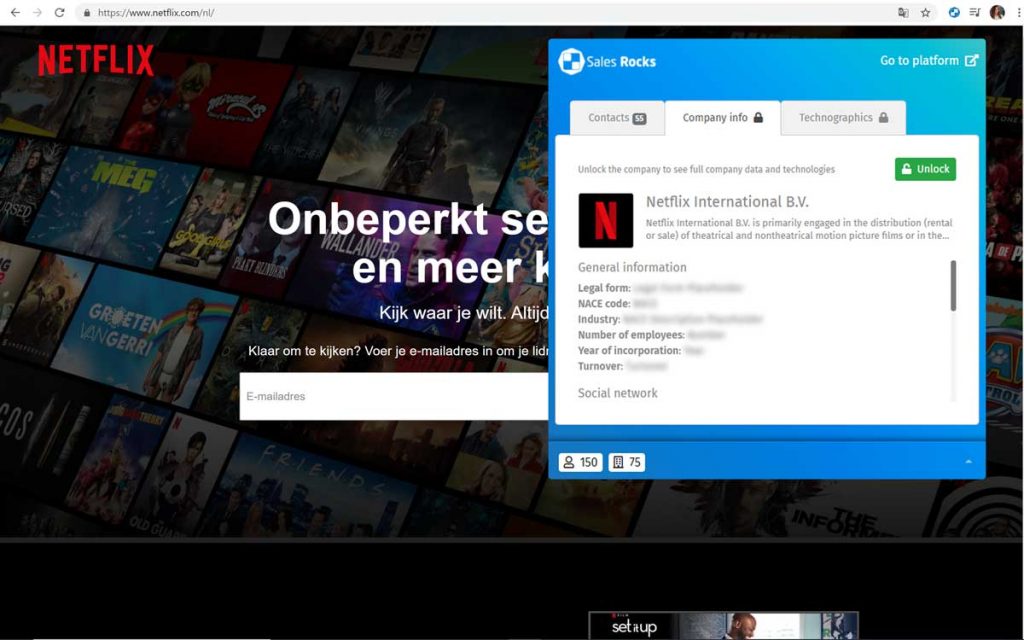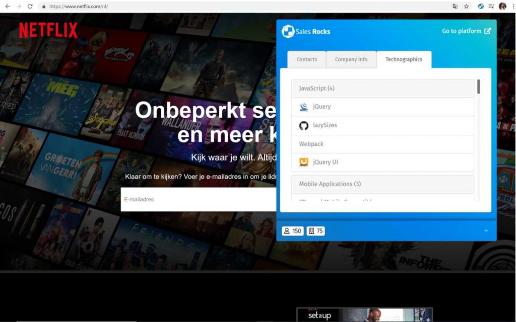 The Sales.Rocks extension has seamless integration with our database offering a vital compact feature set of our existing platform functionality available in your Chrome browser. The three core features of the extension are Contacts, Company Info, and Technographics.