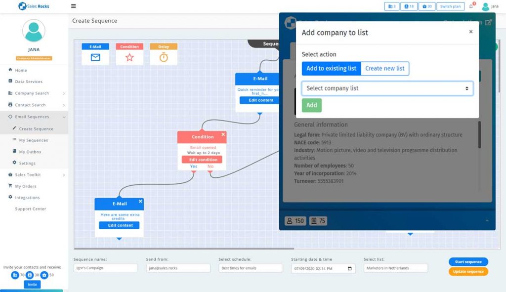 Furthermore, the Chrome Extension works directly with the Sales.Rocks Platform, so once you’ve searched and found the contacts, you can easily save them to a list into your Sales.Rocks account. From there, you can use this specific list of researched companies to set up an outreach campaign through the Drip Campaigns Module.