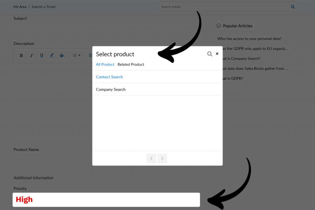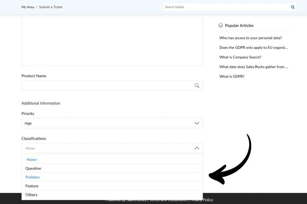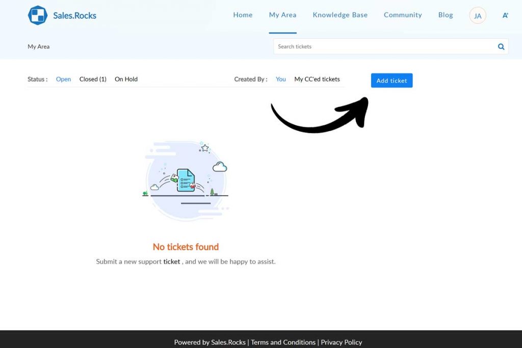 For example create your customer account on help.sales.rocks. Then navigate to “My area” where you will be able to find the “Add ticket” option. Just click and fill in the form, choose the “product” or the feature you are reporting for and the priority. And you’re done!
