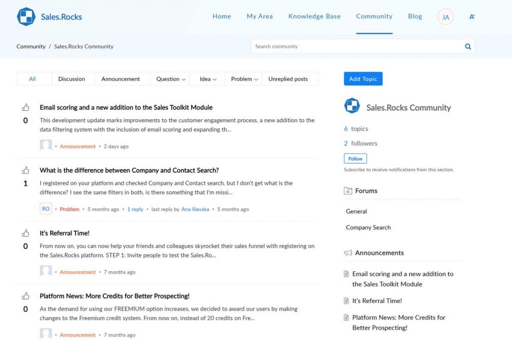 In the Community section you can find the latest feed of answers, discussion points from the team and the other users and also find announcements about new platform updates or user-related news. This way you can always keep up with the latest updates, keep track of your usage score on the platform and also be part of user bonuses.